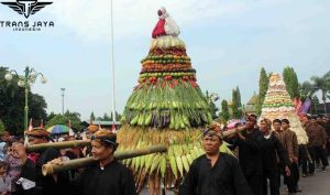 Pada pagi hingga siang hari, masyarakat melakukan pawai gunungan sambil diiringi musik tradisional seperti angklung. Setelah pawai selesai, gunungan tersebut dibagikan kepada masyarakat dan mereka berkumpul untuk makan bersama dari hasil bumi tersebut. Prosesi doa dilakukan untuk memohon agar Tuhan memberkahi hasil bumi dan memberikan rezeki yang berlimpah kepada semua.